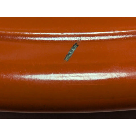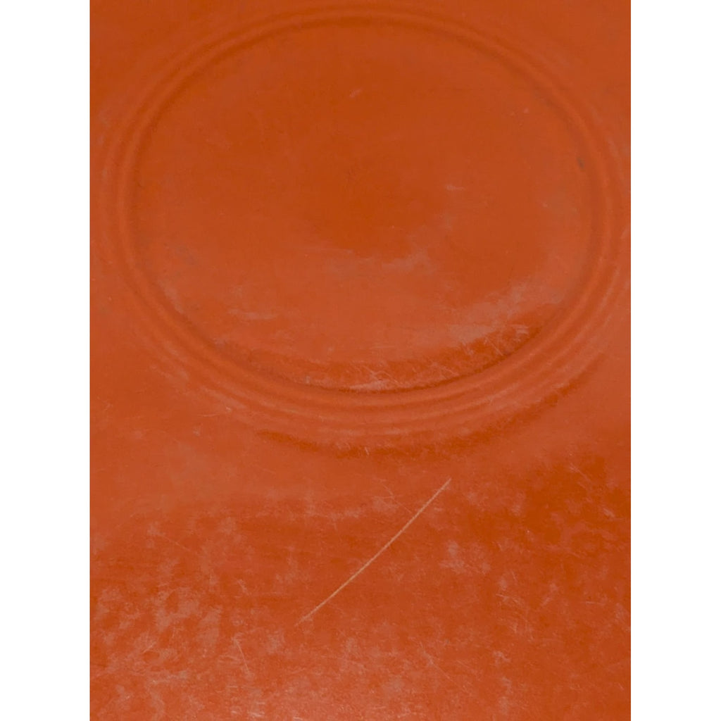Experience the vibrant charm of this 1930s (Unsure of Age) Homer Laughlin Fiesta chop plate in a stunning red orange hue. This ceramic piece measures approximately 14 inches across and bears the iconic concentric ring design. Despite light utensil scratches, minor chips, and a blemish, the plate retains its captivating vintage allure and is a testament to Fiesta’s durable craftsmanship. A collector’s classic, evoking the era’s lively aesthetic and bringing history straight to your table.