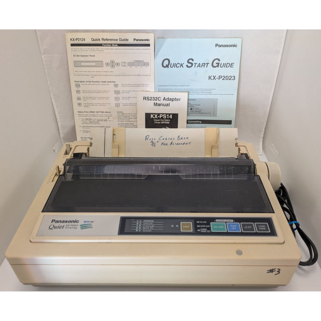 Keywords: Panasonic printer, dot matrix, quiet printing, vintage printer, KX-P2023, 24 pin, retro electronics, beige printer, quiet mode, sturdy printer, font options, durable printer, old tech.