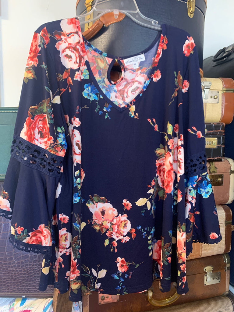 Check out other items for combined shipping! 3X Stem&Vine Womens Shirt Top Navy Floral Bell Sleeve Stretch V Neck Plus VGC