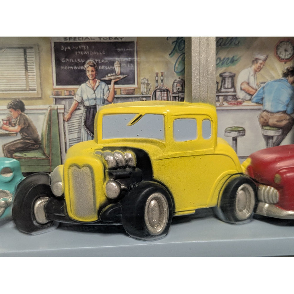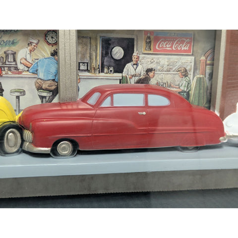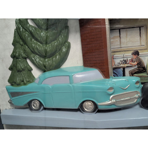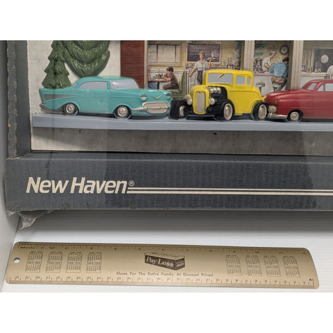 NEW OLD STOCK, been hanging around for years. Step back in time with this New Haven Family Drive-In clock featuring iconic '50s cars, a retro diner scene, and the promise of a better burger era (plus fries)! This lightweight wall clock says, “I’m stylish, battery-powered, and ready for your quirky kitchen or man cave.” The box’s seen some vintage mileage, but who hasn’t?