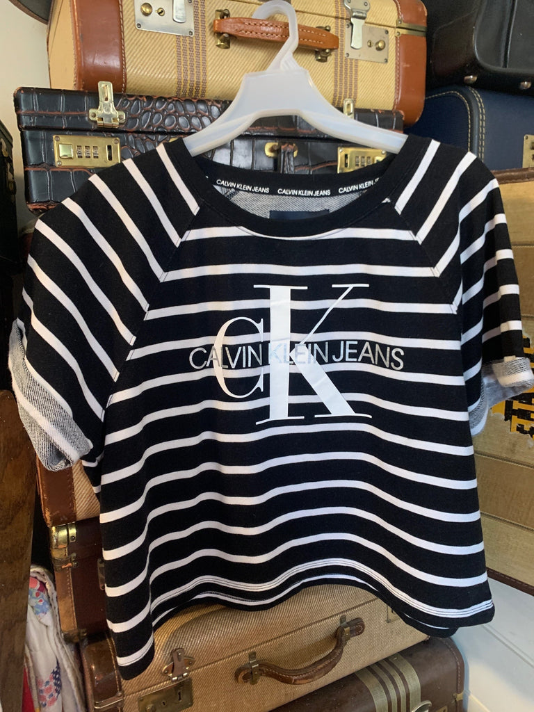 Check out other items for combined shipping! XL Calvin Klein Womens Shirt Top Black, white stripe, crop stretch, logo sporty Regular VGC