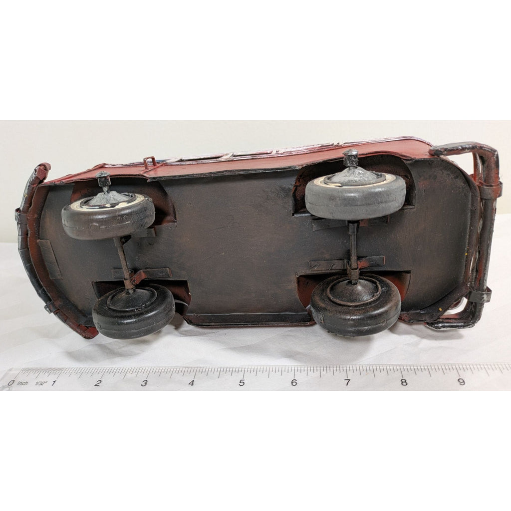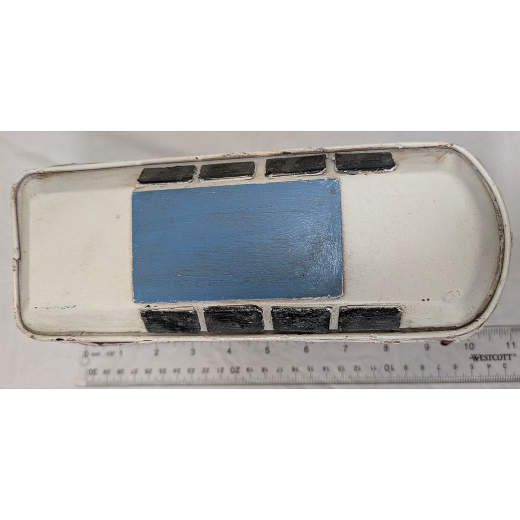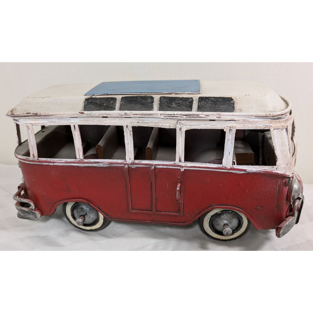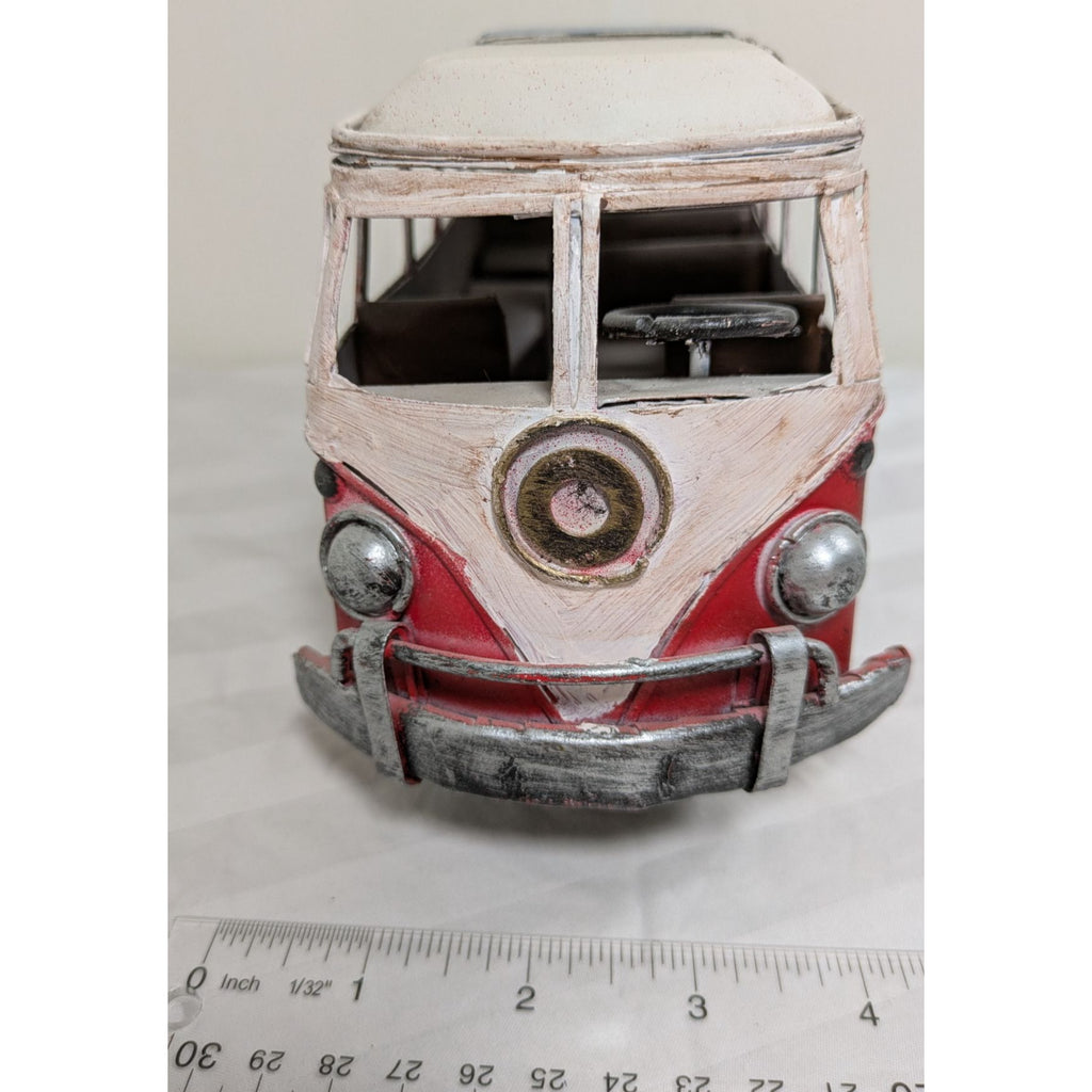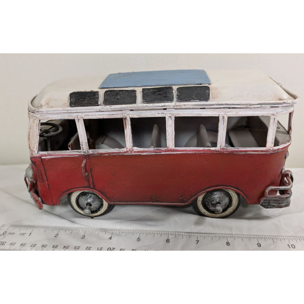 Throwback to the '60s with this charming tin VW bus model! Crafted with a retro red-and-white paint job and a touch of artistic rust, this van is all about vintage vibes—surfboards not included. It measures about 10 inches long and even has a steering wheel to impress its tin occupants.