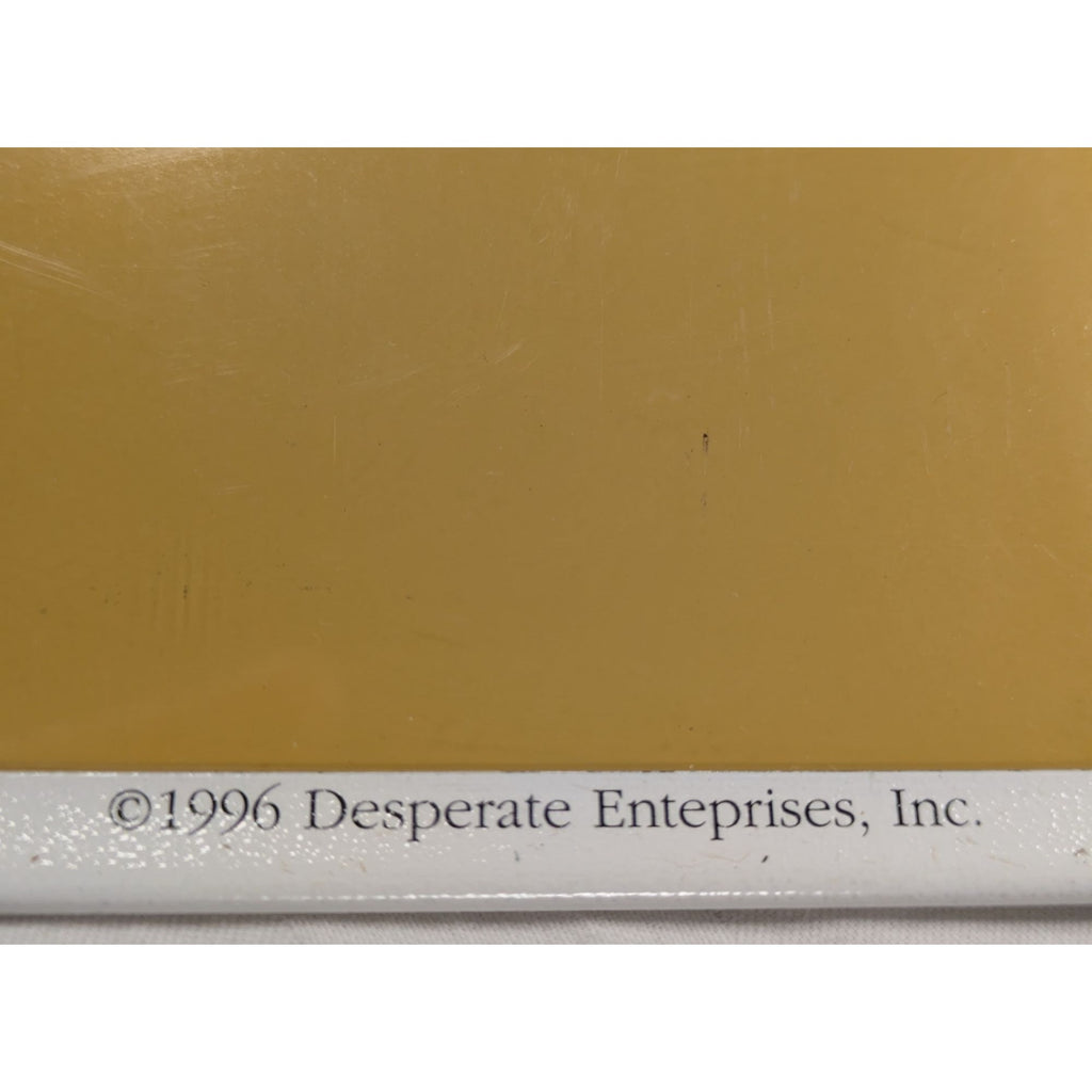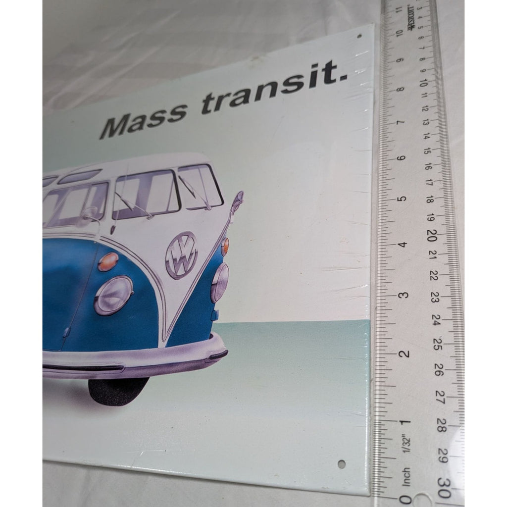 This 1996 tin sign showcases an image of a classic Volkswagen bus captioned "Mass Transit." An all-time favorite for automotive enthusiasts and retro decor lovers, it measures around 15X10 inches and still retains its original shrink-wrap. From Desperate Enterprises Inc., this item is both peace love and happiness—perfect for gifting or jazzing up your space.