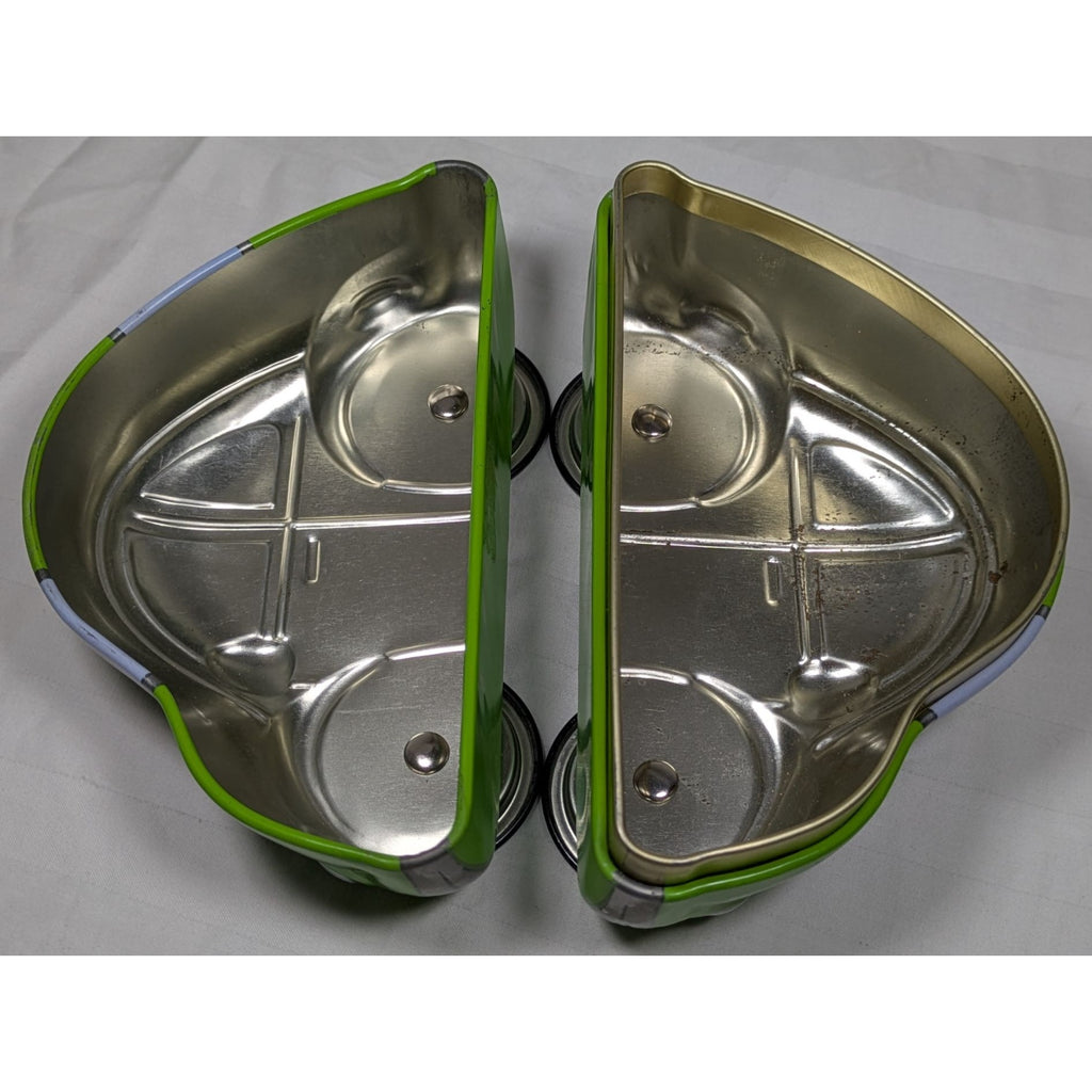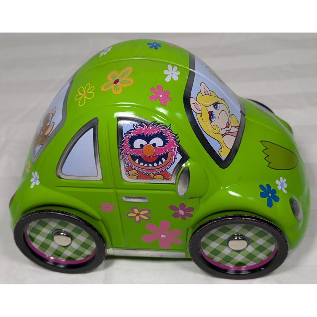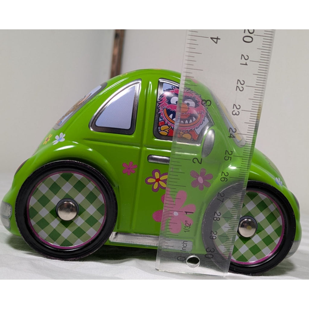 Beep beep! Here’s your chance to own this vibrant green car featuring Fozzie Bear, Kermit, Miss Piggy, and Animal taking the road trip of a lifetime. Bright floral designs and plaid wheels make this little tin car a groovy centerpiece. Slight scratches add a "well-traveled" charm.