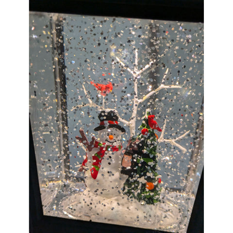 • Features: Light-up scene with glitter snow effect, festive snowman and tree design