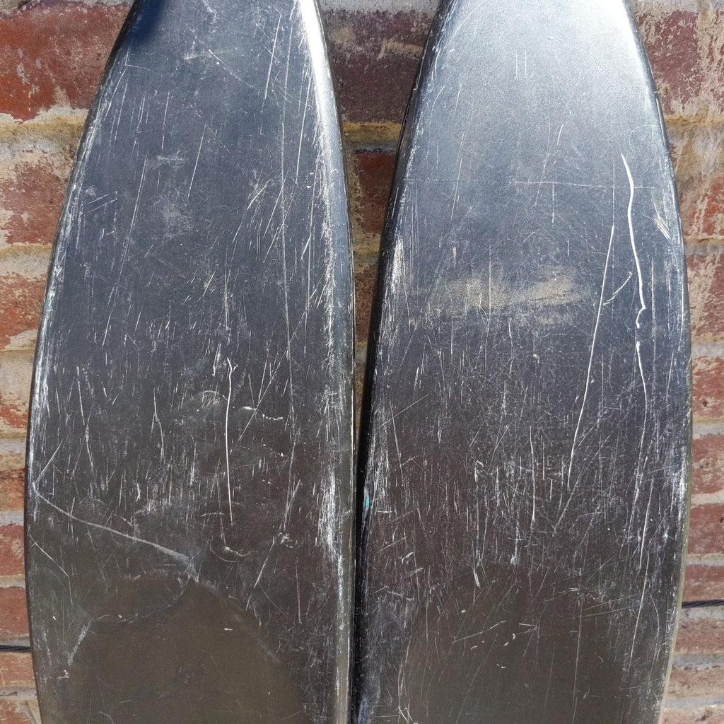 Surface scratches and wear across tips of skis. No significant structural issues.