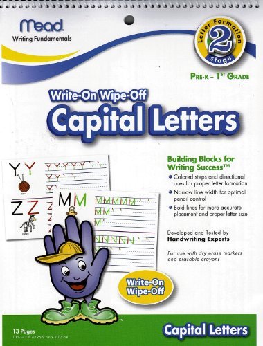 Pre-K - 1st Grade Educational Practice letter formation stage 2 of capital letter writing with wipe on wipe off reusable board. Mead Capital -Letters Dry -Erase Book, 10-5/8 x 8-Inches, 13 Pages (X-569) Colored steps and directional cues reinforce patterns for each letter Pictures included to aid in letter recognition and phonemic awareness Dry erase feature gives children the ability to practice again and again with mistakes easily wiped away Capital Letters 13 Pages UPC:043100541479 MPN:54147 format:Toy Brand:Mead