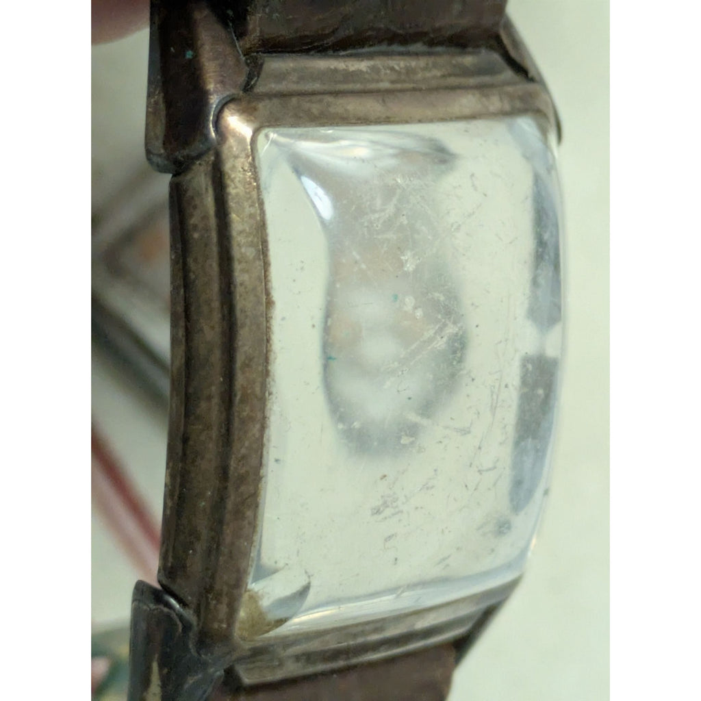 Crystal shows heavy scratches; case has wear. Leather strap in decade-appropriate vintage condition that needs thrown away, keeping it you wish to re-use the clasp.