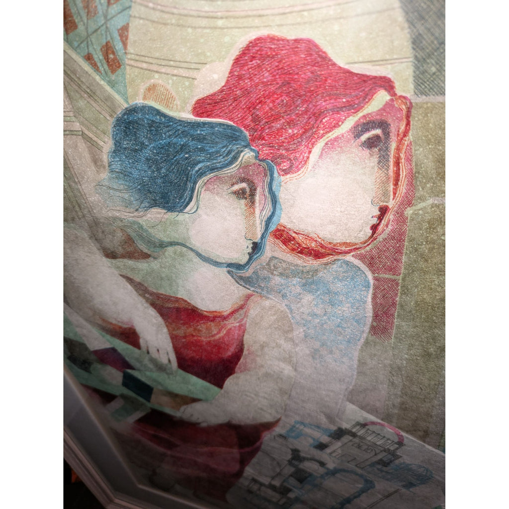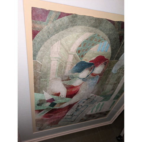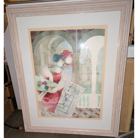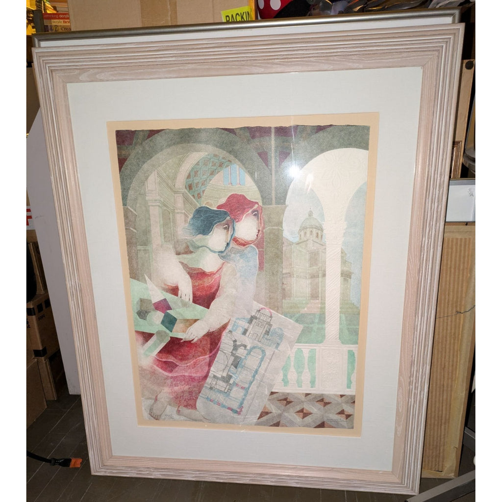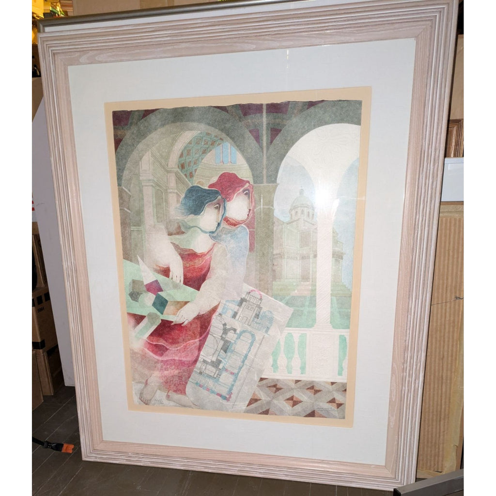 ** Behold this magnificent Alvar Sunol masterpiece that practically screams sophistication while quietly murmuring, "I’m worth it." Ready to hang and improve your home's IQ by at least 20 points, this lithograph celebrates the arts and architecture with smoldering red and blue-haired muses—probably smarter than all of us combined. It's like having your own personal Renaissance without the tights.
