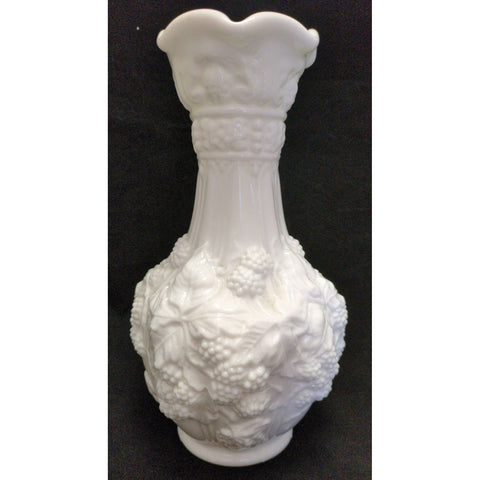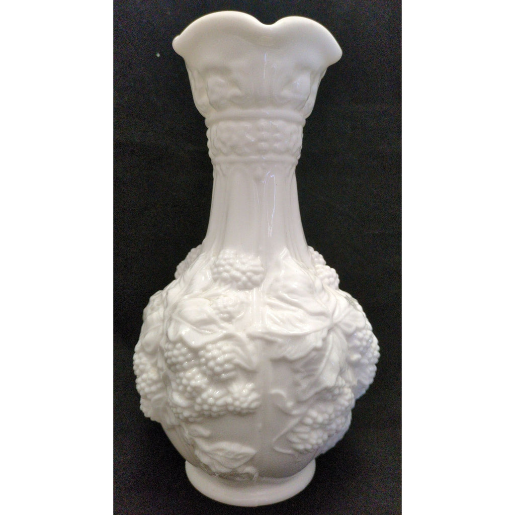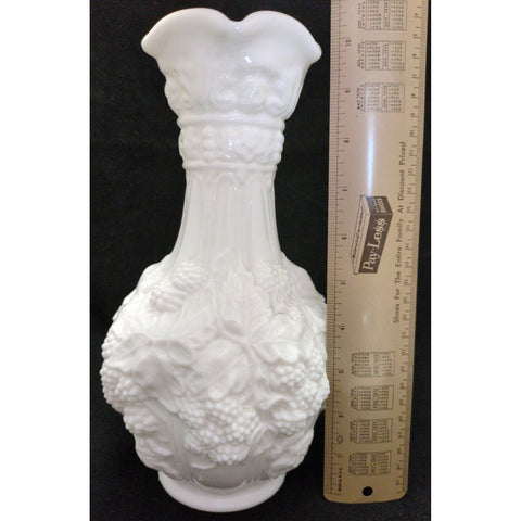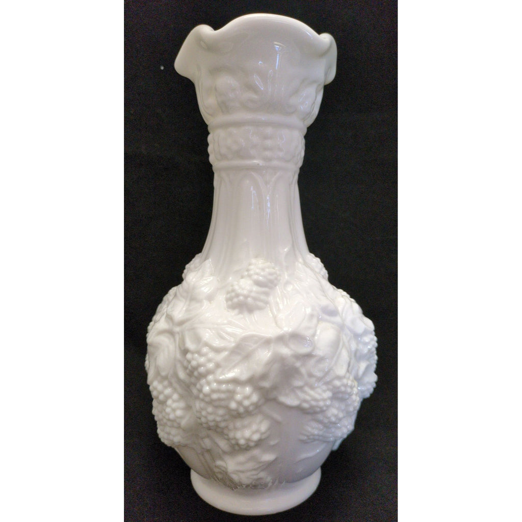 Imperial Glass Vase Loganberry White Milk Glass 10” Tall Vase Grape Leaf Pattern Design