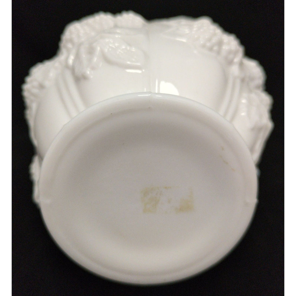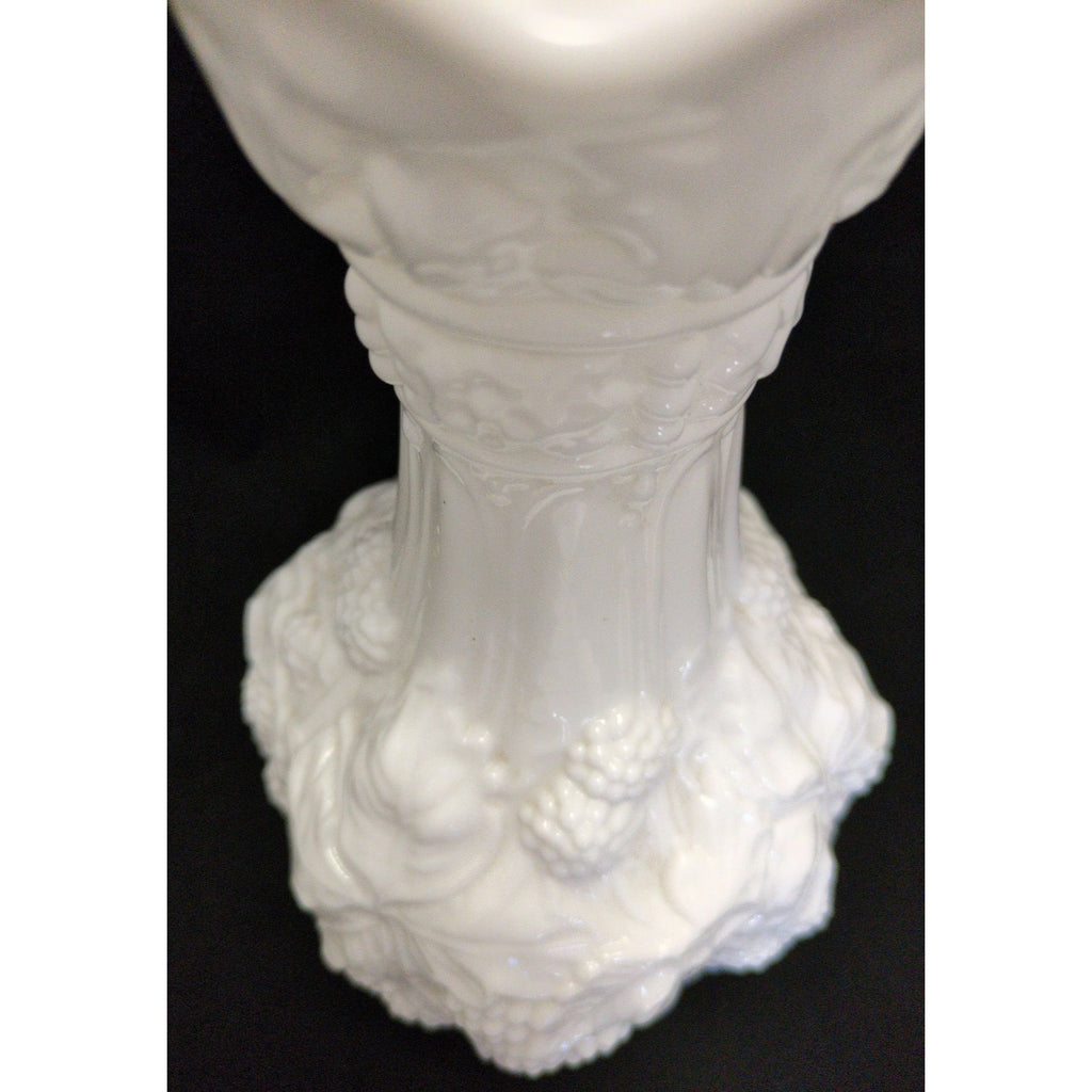 In the realm of timeless elegance, this Imperial milk glass vase stands as a testament to artful craftsmanship. Its opulent grape and leaf motifs evoke pastoral charm, conjuring visions of bountiful vineyards and sun-dappled groves. The rich texture and classic form create a harmonious blend of beauty and history, making it a cherished piece for connoisseurs.