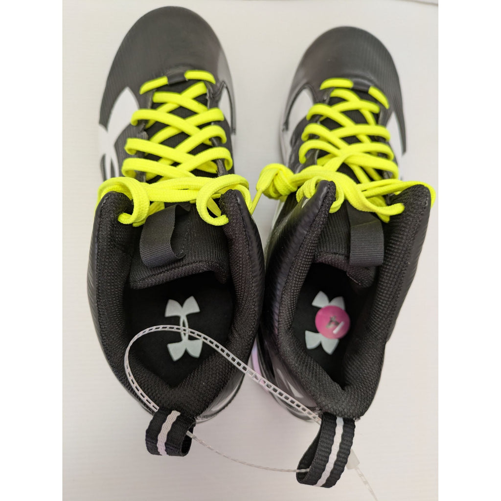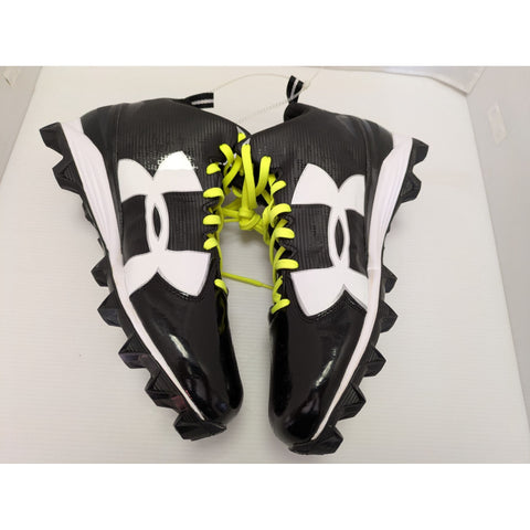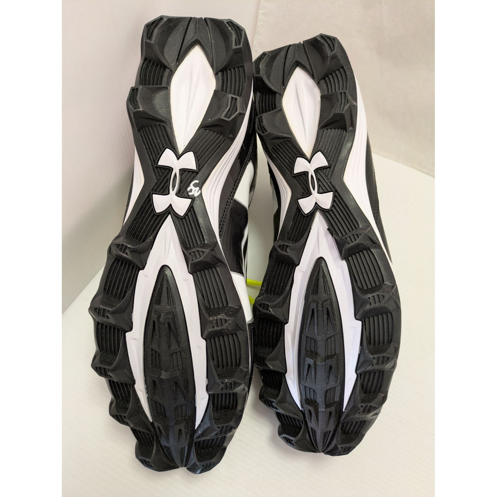 Under Armour baseball cleats, men's molded cleats, size 14 sports shoes, black and white cleats, neon yellow laces, lightweight baseball cleats, synthetic upper sports shoes, rubber sole cleats, athletic shoes for men, durable cleats black/white, sports performance footwear, Under Armour sports gear, men's cleats size 14, baseball shoes lace-up.
