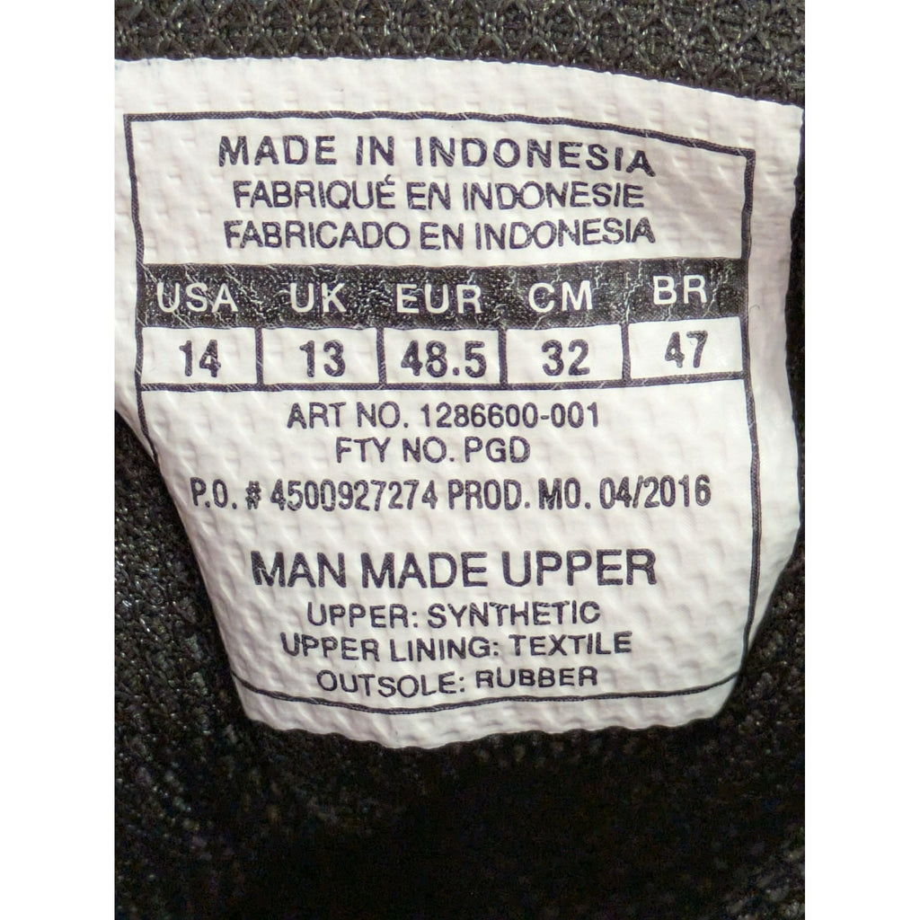 ** These Size 14 Under Armour Men's Baseball Cleats feature a striking black and white design with neon yellow laces. Made in Indonesia, these cleats include a synthetic upper, textile lining, and durable rubber outsole, providing lightweight support and excellent traction with their molded studs. The cleats are ideal for achieving agility and performance on the field while ensuring comfort. The product details include "Art No. 1286600-001" and a date of manufacture, April 2016. With a bold aesthetic and functional design, these cleats deliver both style and reliability, meeting high-performance standards for baseball players. Keywords: