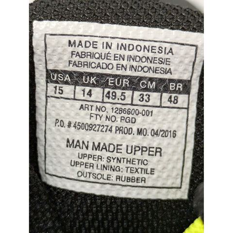 Designed for performance, these cleats offer durability and support with their synthetic uppers, textile lining, and reliable rubber outsole. Their lightweight construction reduces fatigue, while vibrant neon laces provide a secure fit with customizable options. High-performance spikes ensure excellent traction on the field. Manufactured in Indonesia in April 2016, these cleats are made for reliability and style in sports footwear. • Size: 15 (USA), 14 (UK), 49.5 (EU), 33 (CM), 48 (BR)