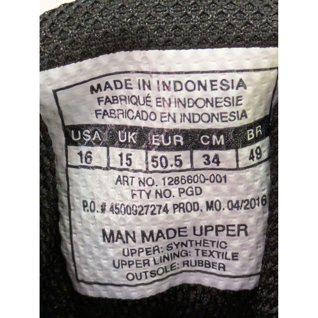 Black, white with neon yellow laces. Made in Indonesia. Manufactured April 2016.