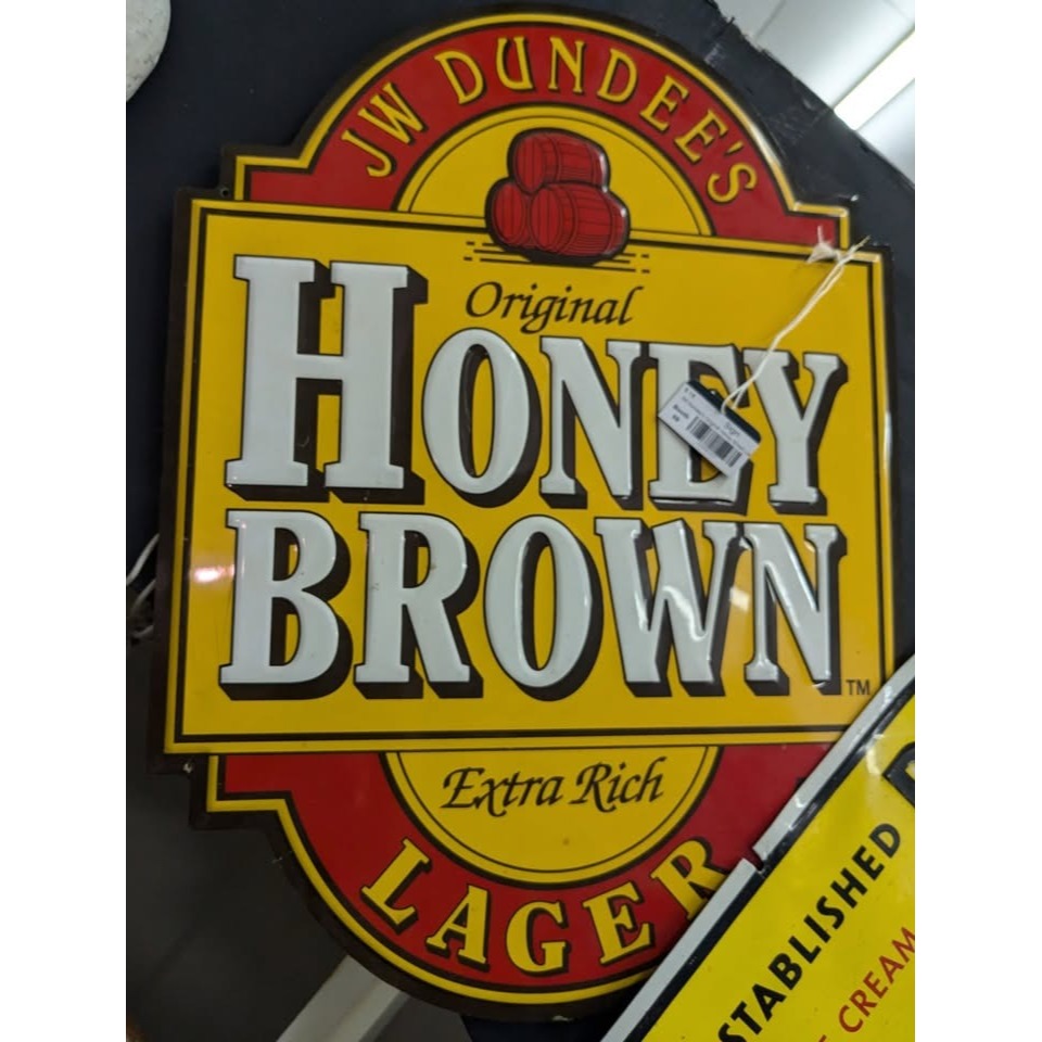 Step right up to this thirst-inducing JW Dundee's Honey Brown Lager sign, guaranteed to make you crave a cold one faster than a cheetah on roller skates. It's the perfect wall decor for beer aficionados or anyone who enjoys a hearty laugh and a hearty brew.