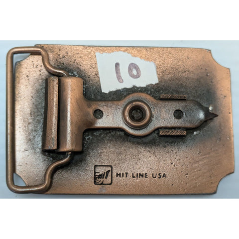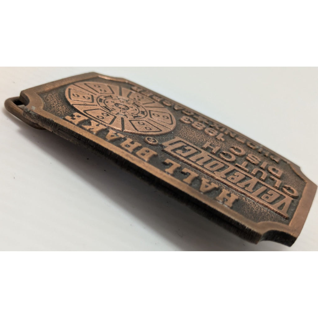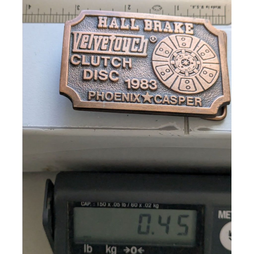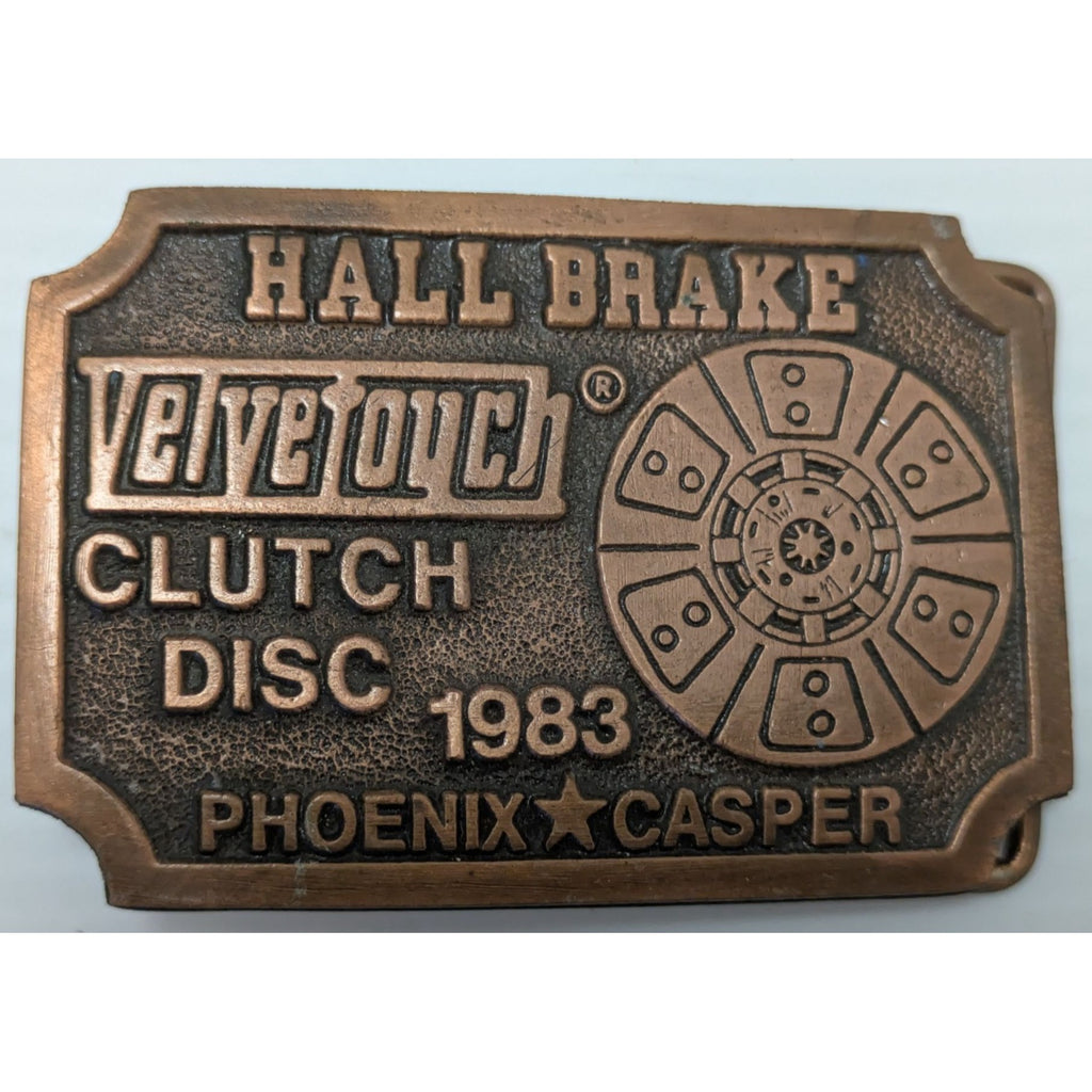 This vintage belt buckle from 1983 features a unique Velvetouch clutch disc design. Ideal for collectors or adding a touch of retro flair to your wardrobe.