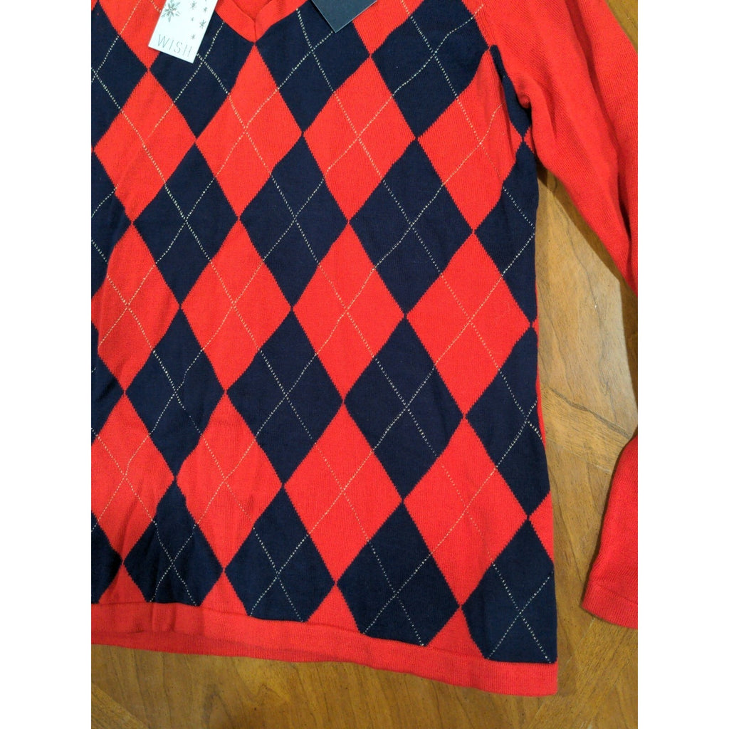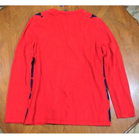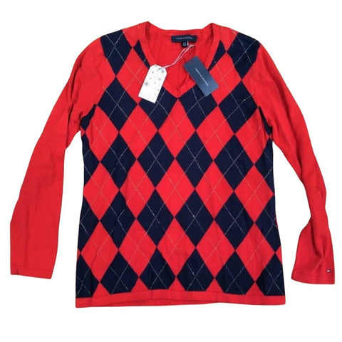 L Tommy Hilfiger Argyle Pima Sweater Large Red & Navy Cotton V-Neck Long Sleeve