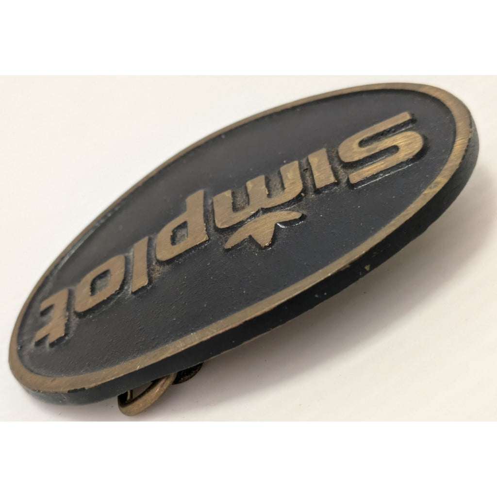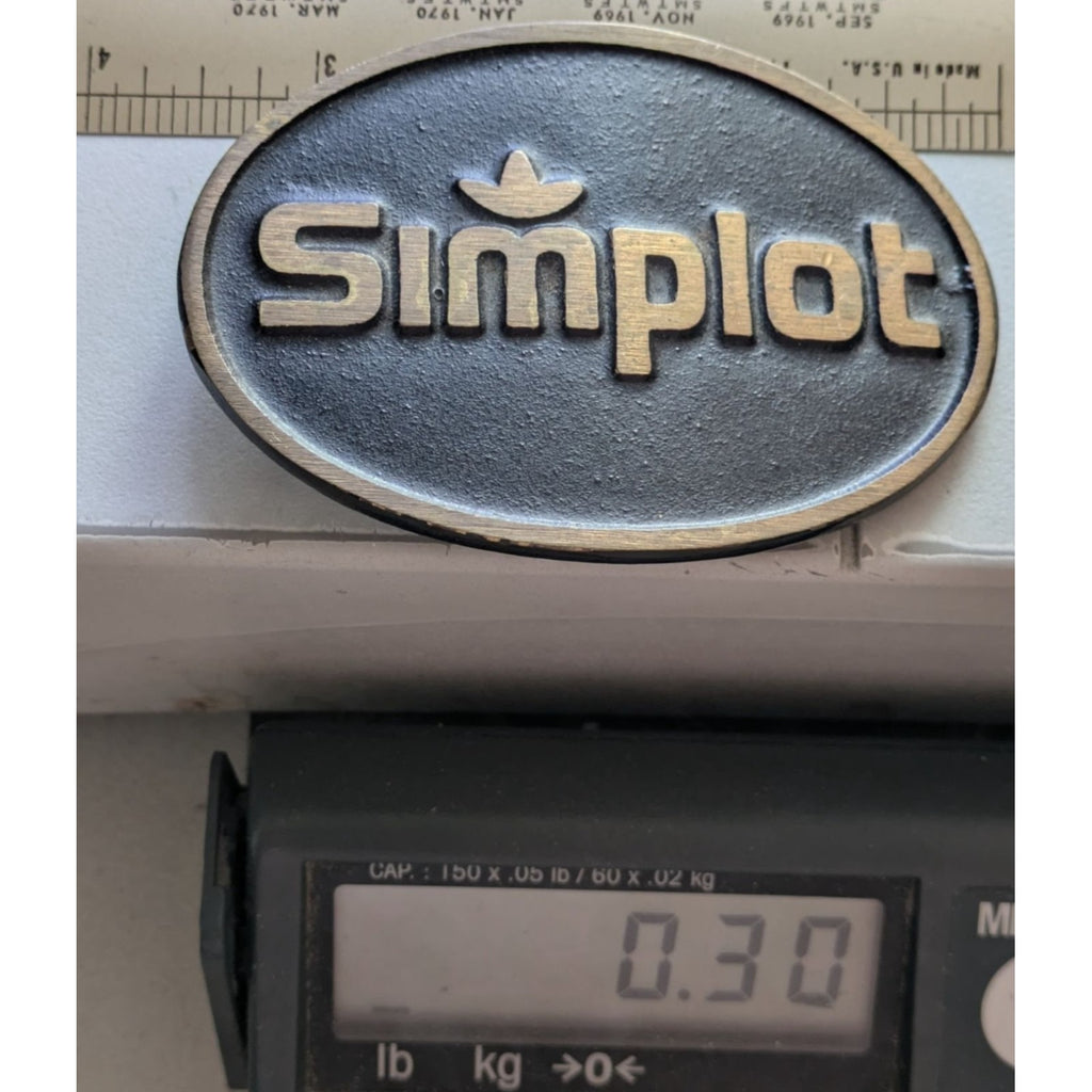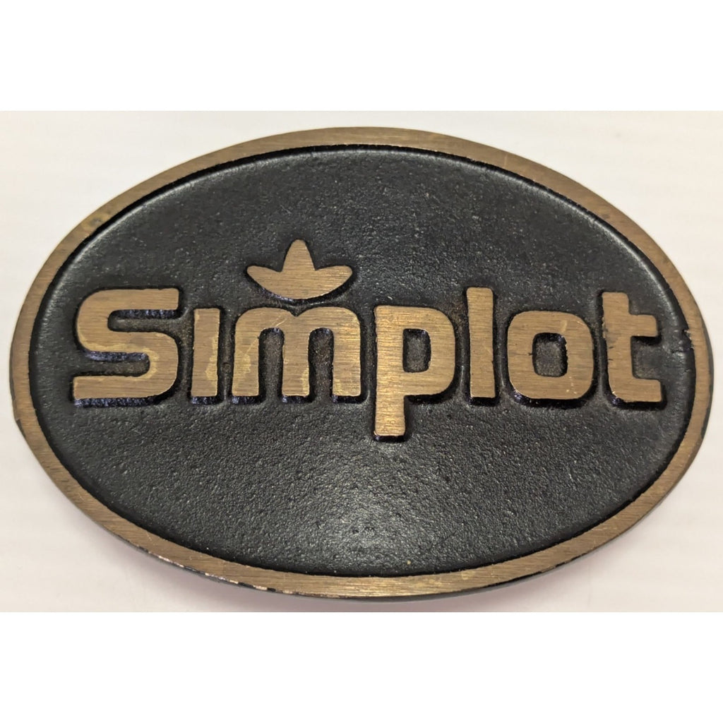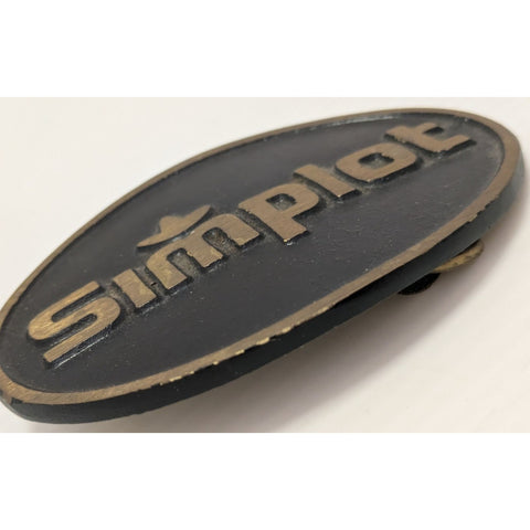 In the annals of industrial iconography, this Simplot belt buckle emerges as a tangible artifact of agricultural innovation, cast with meticulous craftsmanship that speaks to the narrative of American entrepreneurial spirit. The oval medallion, rendered in a dualistic palette of burnished gold and deep charcoal, bears the company's emblem with a subtle crown-like symbol adorning the typography, suggesting both regality and agricultural prowess.
