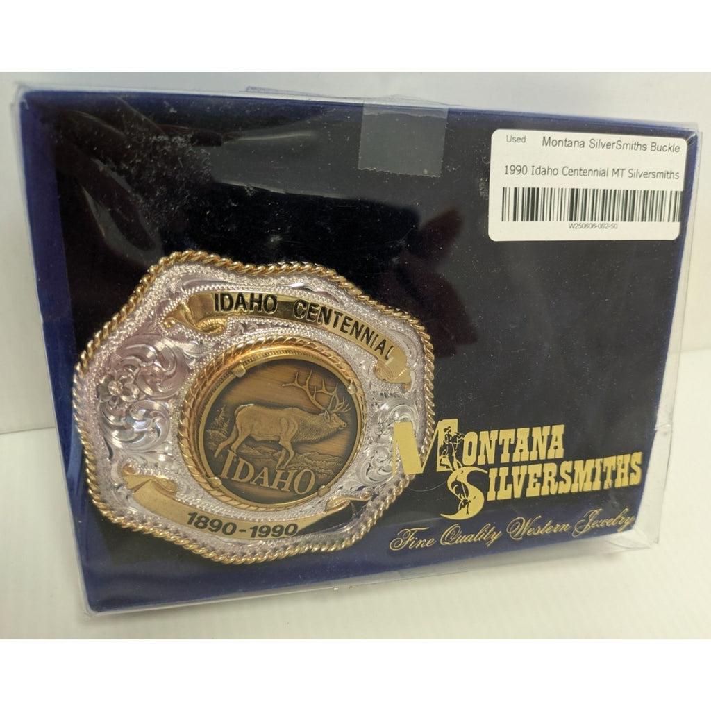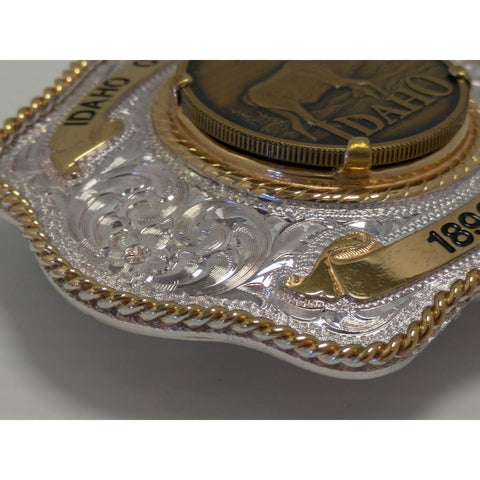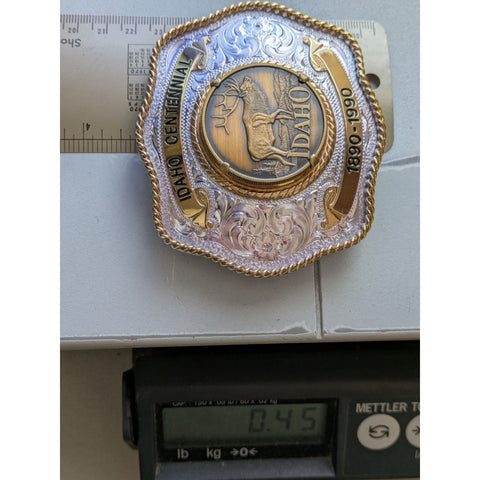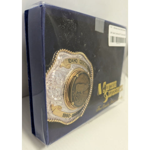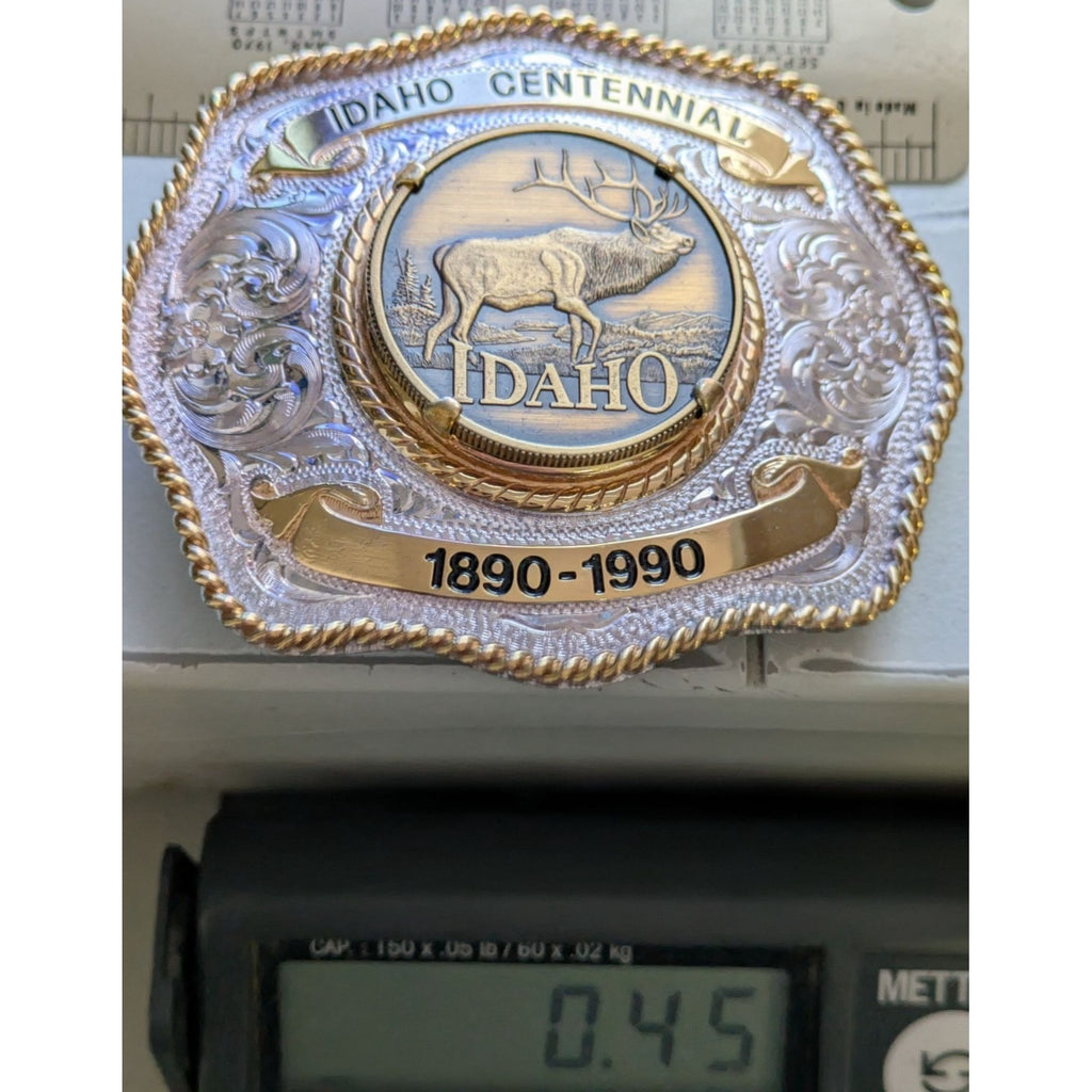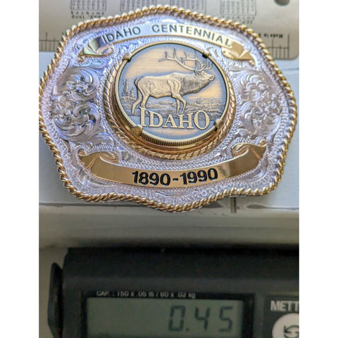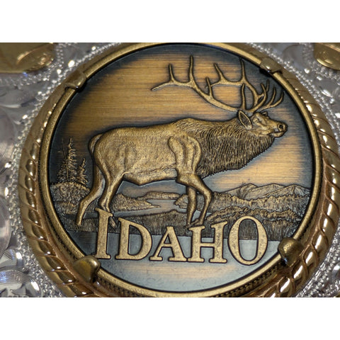 Celebrate Idaho's rich history with this beautifully crafted belt buckle. Made with sterling silver plate, it showcases intricate designs and a majestic elk, encapsulating the spirit of the West. A true treasure for collectors and enthusiasts alike.