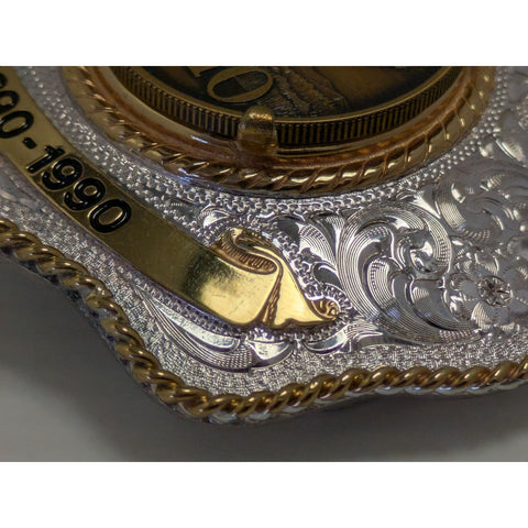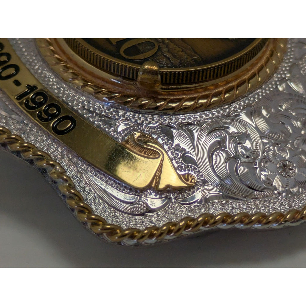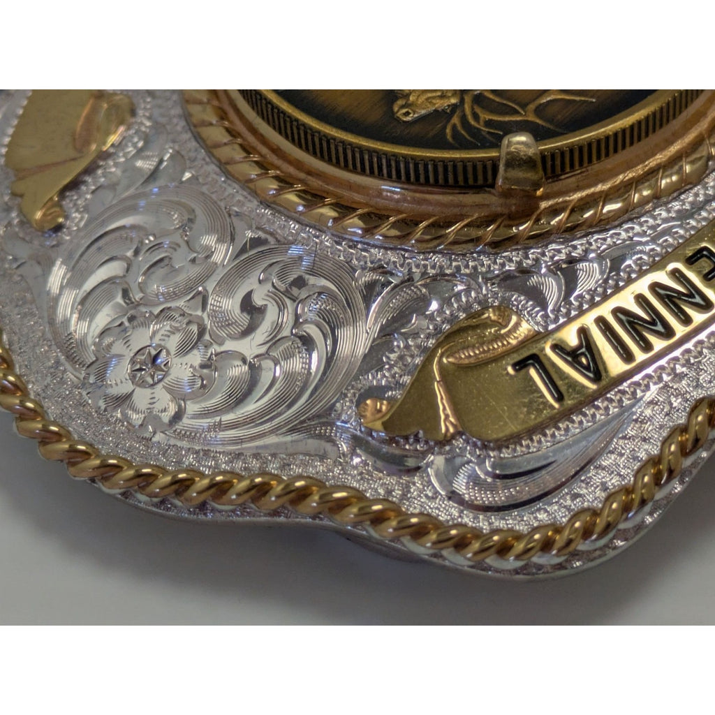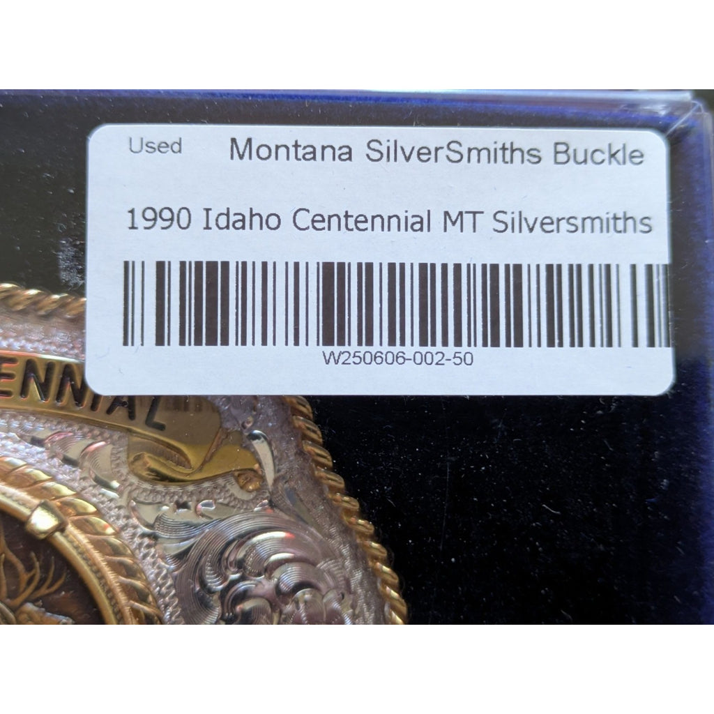Celebrate Idaho's rich history with this beautifully crafted belt buckle. Made with sterling silver plate, it showcases intricate designs and a majestic elk, encapsulating the spirit of the West. A true treasure for collectors and enthusiasts alike.