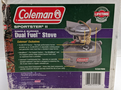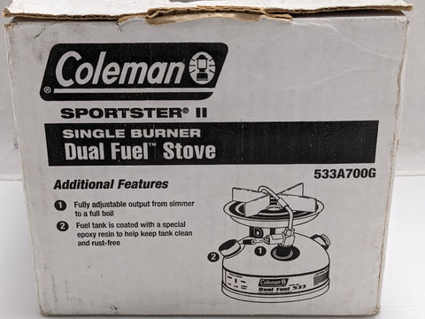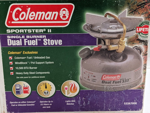 COLEMAN Sportster II Model 533 stove is perfect for outdoor enthusiasts who want to cook on the go. It features a single burner and can use either dual fuel for convenience. The stove system is made of stainless steel and comes with a funnel for easy and mess-free filling.